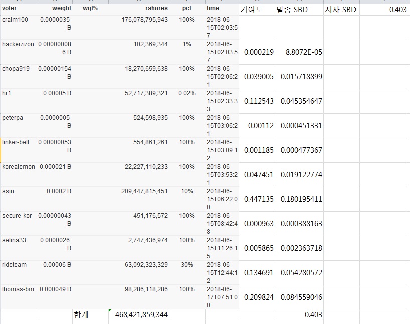 우선 steemd에서 확인한 기여도로 지급 받을 SBD 계산 파일입니다.