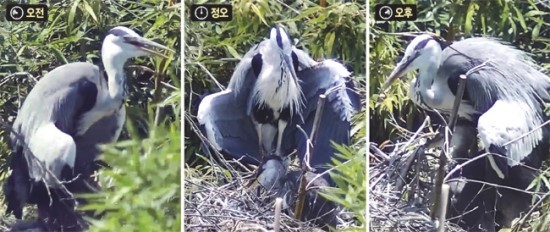 ▼폭염속 왜가리의 母情. 온종일 자신의 날개로 새끼들에게 그늘... 7월 31일 울산 태화강 대나무 숲에서 CCTV에 잡힌 모습