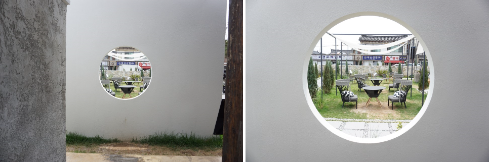동그란 원 너머에 잘 꾸며진 정원이 원 너머로 보이네요.