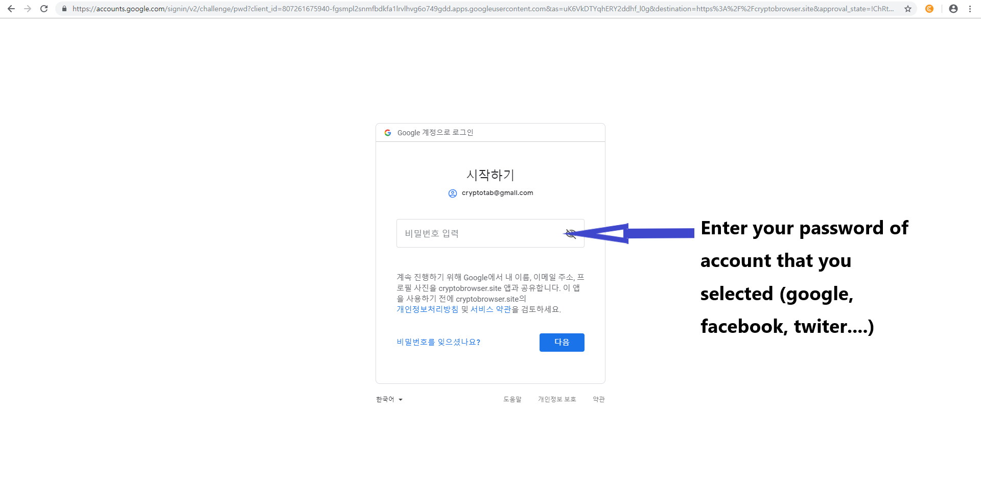 쉽죠 ???? 구글계좌로 했으니 구글계좌 비번을 입력하시면 로그인 됩니다.