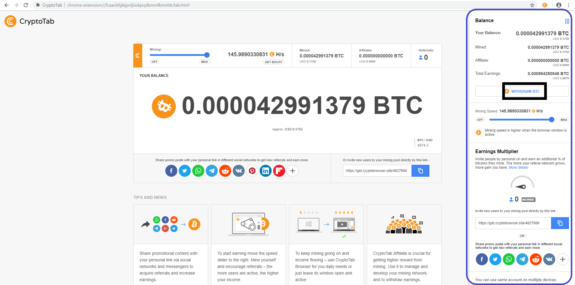 1000사토시 정도만 채굴하여도 바로 인출 가능합니다.