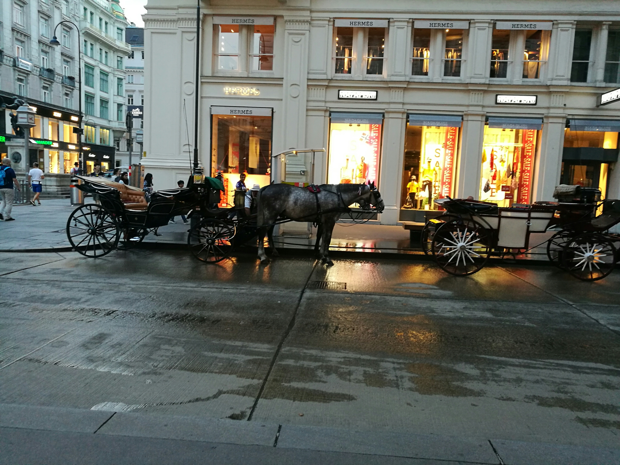 에르메스 매장 앞에 마차가 서있어요.