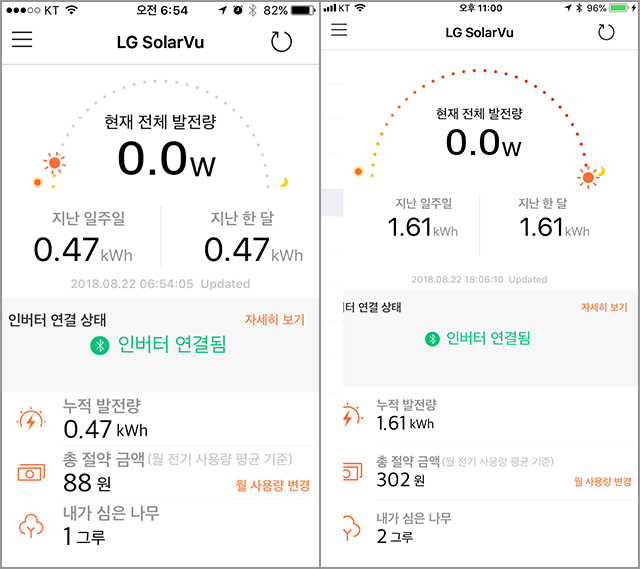 설치한 어제는 비도오고 0.47kW 가 발전되었었는데 오늘은 1.14kW 가 발전되었다. 하루에 평균 0.9~1kW 정도 예상했는데 비슷한 듯하다.