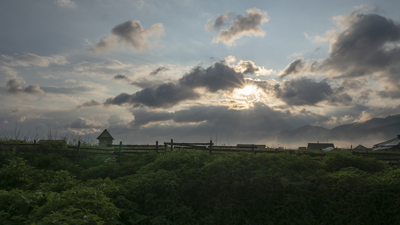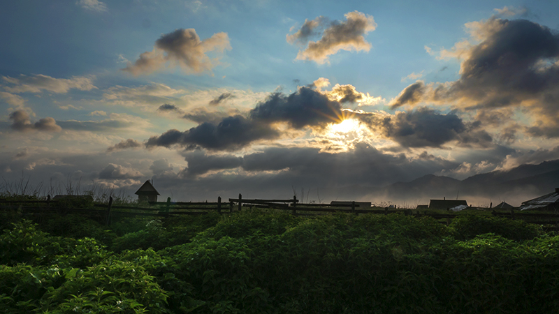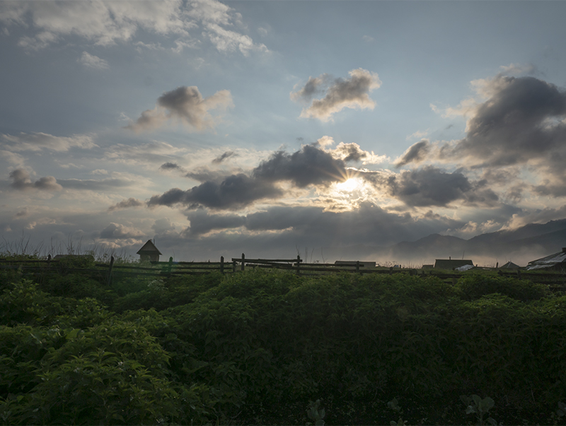 하늘,구름, 오른쪽에 보이는 산...안개(?) 등을 위해 누른다. 조리개날 덕에 햇살이....