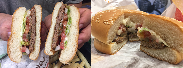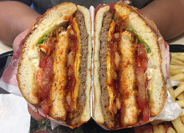 소고기,닭고기,돼지고기 가 다들어있다. 와퍼에 들어있는 그 불향나는 쇠고기 패티...얇아~ 베이컨...그러니까 훈제삼겹살이 있고 퍽퍽하게 보이는 닭가슴살패티가 들어있고 토마토,양파, 양상추는 존재만하는 듯...뻘~건 소스와 마요네즈 같은 햐얀 소스...