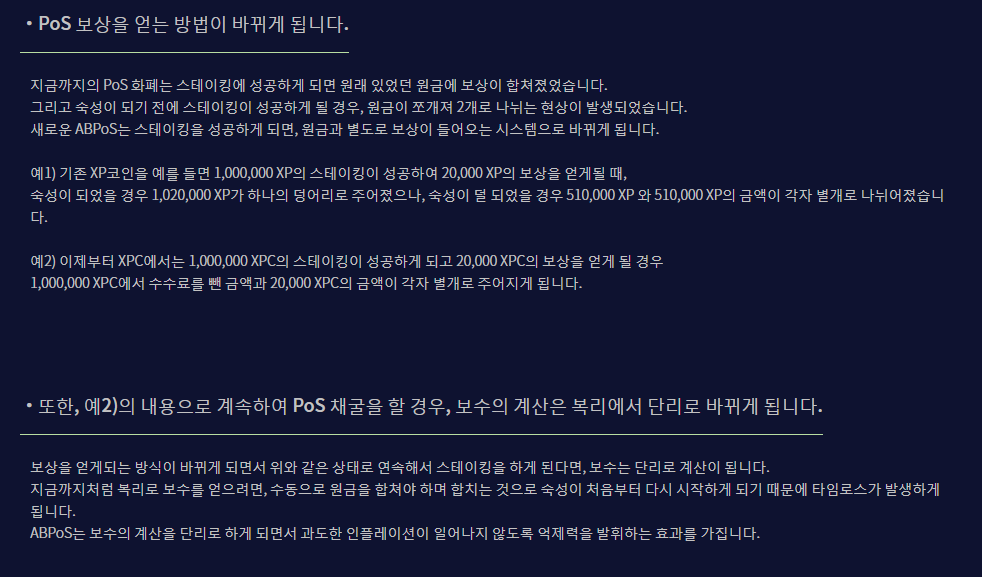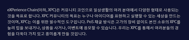 문자는 많지만 그냥 짧게~ "XPC는 POS를 지원하는 암호화폐" 정도로 축약되지 않을까? XPC자리에 다른 어떤 코인의 이름으로 바꿔도 된다. 물론 POS를 지원하는 코인. 이런 설명은 물론 XPC뿐만 아니라 다른 코인의 홈페이지에도 비슷한 수준의 설명들이 많다.