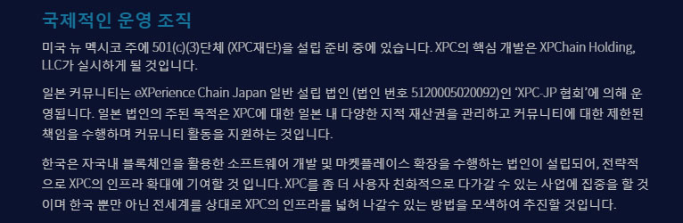 코인 관련한 법인의 등록이 쉽지 않은 일본에서 두번째로 법인등록을 한 코인이 XPC라고 한다. 우리나라에서도 얼마전 법인을 등록완료했다.