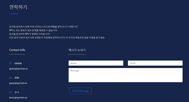 마지막으로 "연락하기" 문의하기 전에 FQA를 읽어보는 것은 좋다. 그런데 다른데 가서 읽으란다. FQA 정도는 홈페이지에서 바로 링크되어 보여지는게 접근성이 좋지않을까? 뭐 XPC는 커뮤니티코인이라고 하니 궁금해서 홈페이지에 찾아온 모든 인원을 가입시키려는 의도?