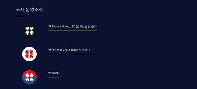 "운영조직"... 미국,일본,한국 법인들이 있다. 일본법인의 정보가 홈페이지를 처음봤었을 땐 있었는데 없다. XPC...XPCHAIN 홈페이지 살펴보기~! 4 : "특징" 에 "국제적인 운영 조직"설명에 나와있다.