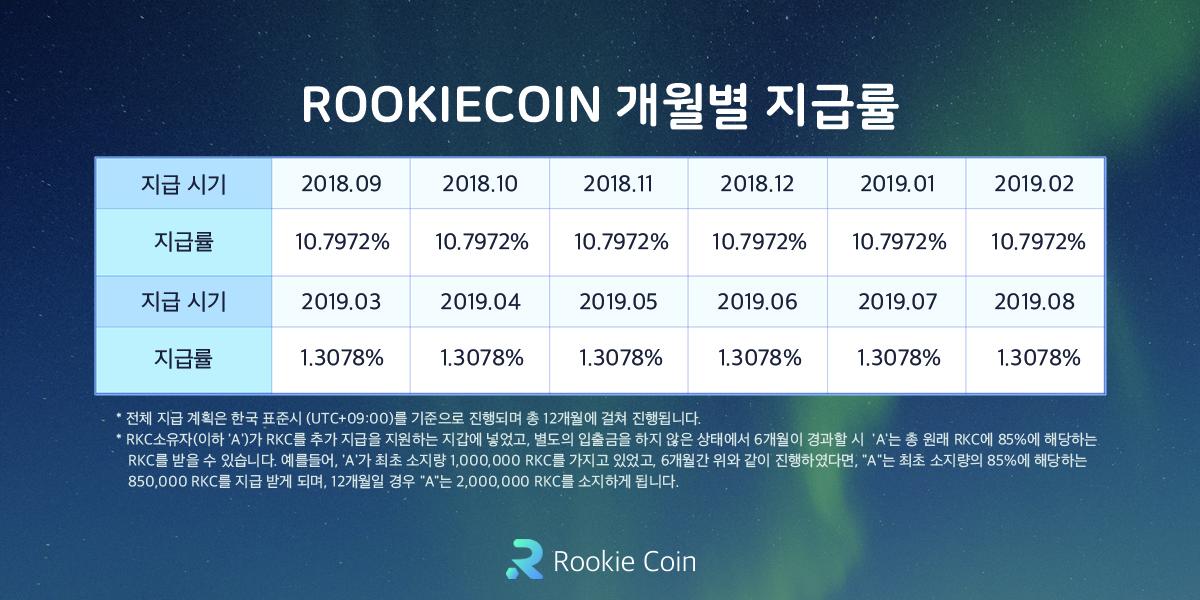 해당 보상은 1,000,000RKC이상의 홀더들에게 적용되어 지급되며 2018년 9월부터 2019년 2월까지 6개월은 10.7972의 높은 이자율의 보상이 지급되며 3월부터는 1.3078%의 이자율로 보상이 지급됩니다.