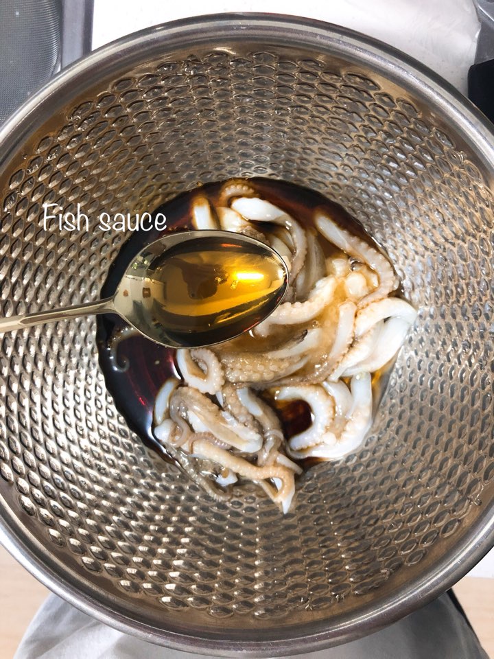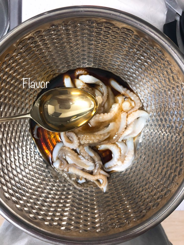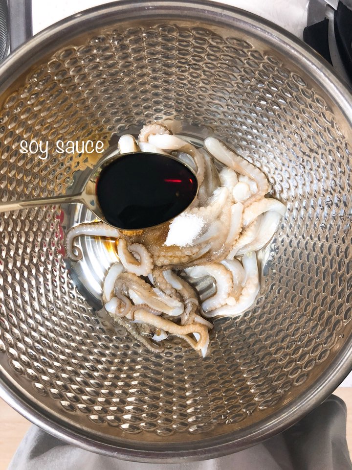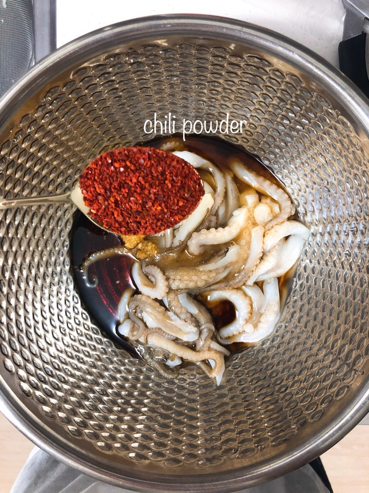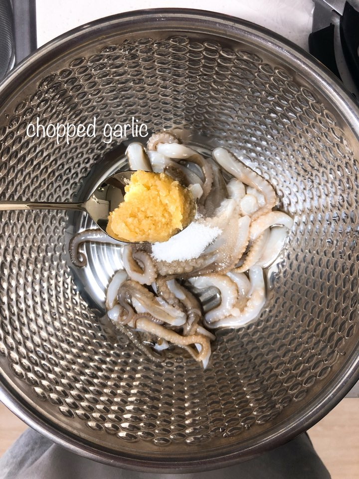 저는 해산물이나 고기류는 항상 맛술 조금 뿌려서 버무려 주어요. 그러면 비린내나 누린내가 없어져서 상큼하게 요리할 수 있답니다.