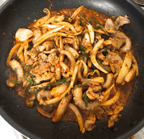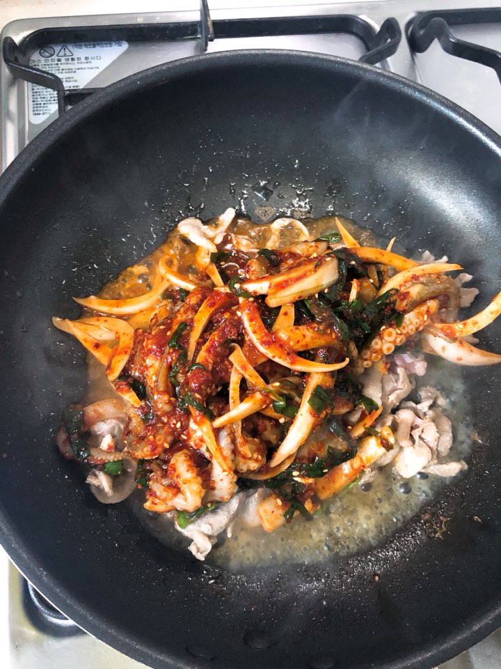 (12) 지글지글 잘 볶아줍니다. 너무 오래 볶으면 쭈꾸미가 질겨지니, 중약불에서 잘 보아가며 익혀주세요.