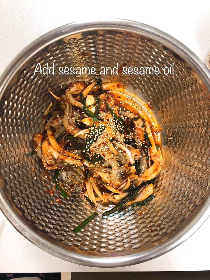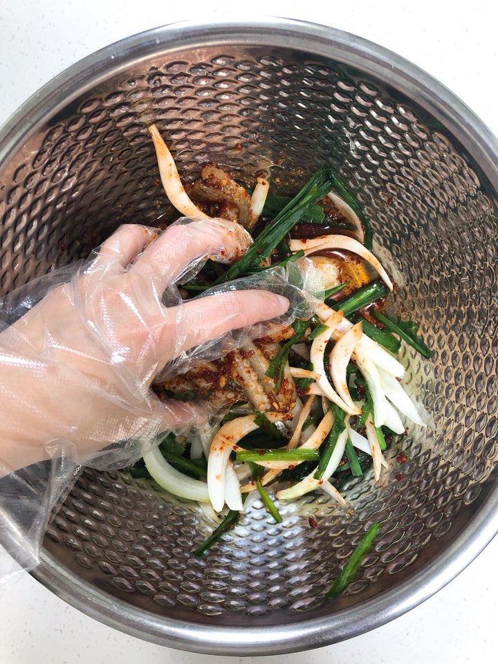 (8) 양파랑 부추, 그리고 쪽파까지 넣어 조물조물 버무려줍니다.