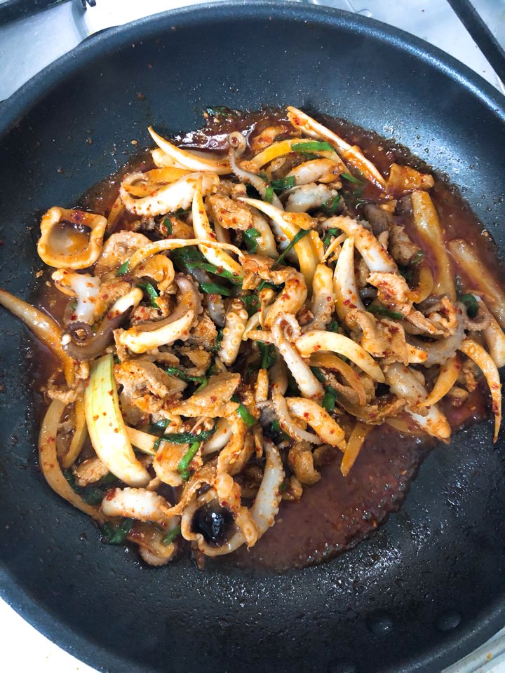 오리불고기 200g, 쭈꾸미 1.5마리, 양파 반개, 쪽파랑 부추 조금,
