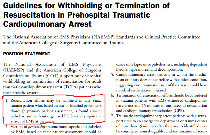 미국 응급의학회 (The National Association of EMS Physicians (NAEMSP) Standards and Clinical Practice Committee and the American College of Surgeons Committee on Trauma) 에서 제시한 외상에 의한 CPR 중단 기준에 구급대가 현장에 도착했는데 환자의 맥박이 없으면 CPR 을 시행하지 않도록 가이드라인이 되어 있다. 왜냐하면 외상에 의한 심장마비인데 현장에서 맥박이 없다면 살릴 수가 없기 때문이다. 의학의 최선진국인 미국에서도 살릴 수가 없단다. 실제로 나도 응급실에서 다년간 일하면서 중증 외상환자의 심장마비는 어떤 치료를 했어도 단 한 명도 살린 기억이 없다.