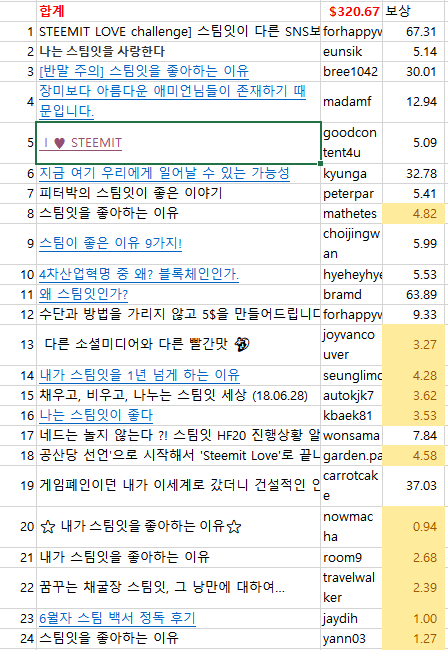 STEEMIT love challenge 하자고 올린게 얼마되지도 않았는데 24개의 관련 포스팅이 벌써 올라왔습니다. STEEMITLOVE challenge 로 찍혀나온 보상은 이미 320$에 육박하였습니다!!! 부끄러움을 잊으신 채 숨겨왔던 스팀잇에 사랑을 표출하신 모든 스티미언님들의 힘이 아닐까 싶습니다.