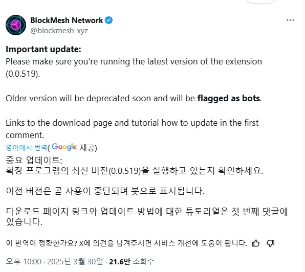 블록메쉬 노드 채굴 하시는 분 확장 프로그램 업데이트 하세요!