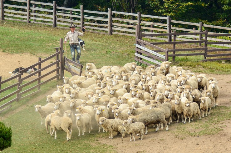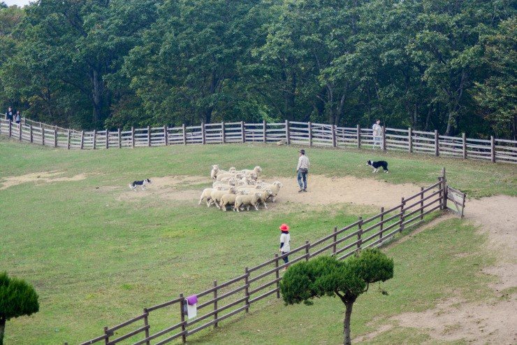 다 내려오면 양떼 목장에서 매일 오전 11시 오후 1시 3시에 양몰이 공연을 합니다. 공연은 20분 정도 하는데 이 공연이 정말 볼만합니다. 2마리의 양몰이 개가 양을 몹니다. 양 몰이 개는 보더콜리 남녀 한 쌍입니다. 양몰이 개는 여러 종류가 있습니다. 아이리쉬 콜리, 세퍼드, 아이리쉬 테리어, 샤보이, 킹 파드, 달마시안, 독일 양 푸들 등이 모는데 공통점은 달리기가 빨라야 하고 머리가 똑독해야 합니다.