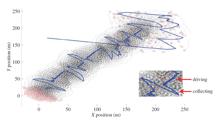 이 양몰이 개의 행동을 연구하기 위해서 양몰이 개와 양에게 GPS 센서를 달았습니다. 양은 빨간 점이고 양몰이 개는 파란 점입니다. 양몰이 개는 2가지의 알고리즘 행동을 통해서 양 무리를 통제하고 이동시킵니다.