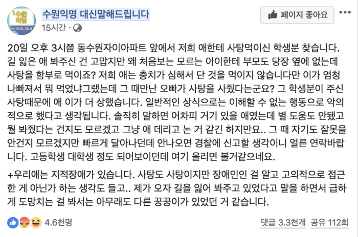 지난 22일 수원 지역 익명 제보 페이스북 페이지 '수원익명 대신말해드립니다'에 지난 20일 한 아파트단지 근처에서 있었던 사건에 대한 게시물이 올라왔다. 딸 아이 엄마라고 소개한 제보자는 아이에게 사탕을 먹인 낯선 학생을 찾았다.