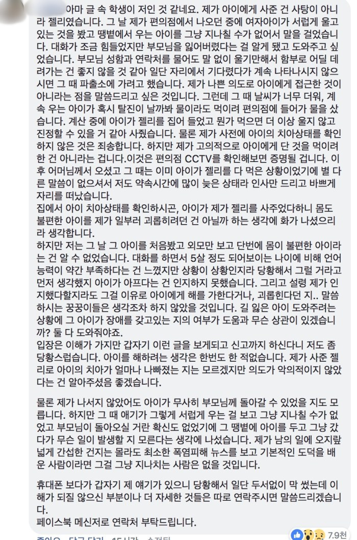 학생은 아이를 데리고 멀리 벗어나지 않고 근처에서 부모를 기다렸다. 그는 날씨가 너무 더워 물이라도 사주기 위해 편의점에 들어갔다가 아이가 젤리를 집어 들어 그것을 사줬다고 밝혔다. 그는 오히려 제보자에게 "사전에 아이의 치아상태를 확인하지 않은 것은 죄송합니다"라며 사과했다.
