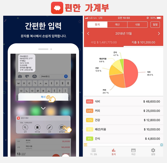 소비 관리를 도와주는 어플을 이용하면 좀 더 편리합니다. 여러 가지 어플들이 있지만, 그 중 “편한 가계부”와 “브로콜리”를 추천하고 싶네요.