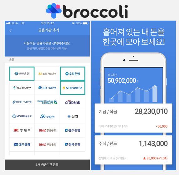 브로콜리는 가계부에서 한걸음 더 나아간 자산관리 어플입니다! 공인인증서를 어플에 저장하여 금융 계좌, 사용 카드 등의 정보를 한눈에 볼 수 있다는 장점이 있습니다. 저는 사용하는 금융기관이 4개 이상인지라 이러한 기능이 꼭 필요했는데요, 이번 기회에 브로콜리를 통해 체계적인 관리를 할 수 있을 것 같습니다! 😊