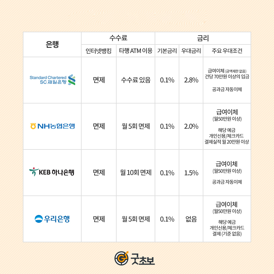 그런데 급여통장을 고르는 것에서부터 재테크가 시작됩니다! 은행들은 급여통장에 대해 수수료 면제, 금리 우대 등의 혜택을 제공하기 때문입니다.