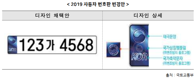 주요 변경점으로는 첫째, 번호판 좌측에 새로운 디자인이 들어갑니다. 둘째, 상단에는 우리나라 국기를 형상화한 태극문양이 중앙과 하단에는 위변조 방지를 위해 홀로그램이 삽입됩니다. 마지막으로 셋째, 현행 서체는 그대로 유지됩니다.