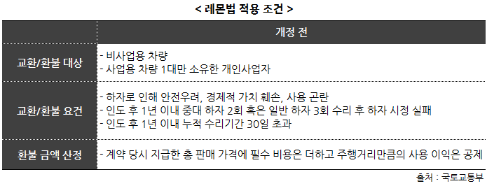 중요한 점은 레몬법 도입으로 이전에는 소비자가 결함이 있다는 사실을 증명해야 했다면 이제부터는 제조사가 결함 사실이 없다는 것을 밝혀야 하도록 바뀌었습니다.