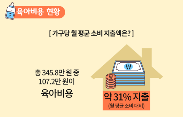만 9세 이하 아이를 키우는 가정에서는 월평균 소비지출액의 3분의 1에 달하는 금액, 107만 원이 자녀 육아비용으로 지출된다고 합니다.