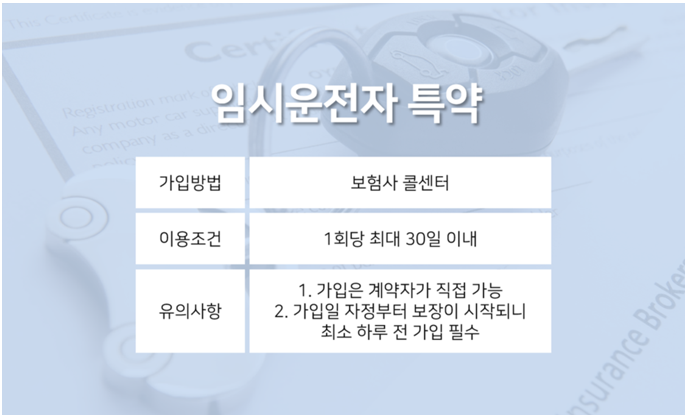 보험사 콜센터를 통해 필요할 때 바로 가입할 수 있습니다. 일 보험료는 약 2,000원이고 최장 30일까지 가입이 가능합니다. 단, 특약 가입일 24시 이후부터 보상 효력이 발생하므로 최소 하루 전에는 가입해야 한다는 사실을 기억하세요.