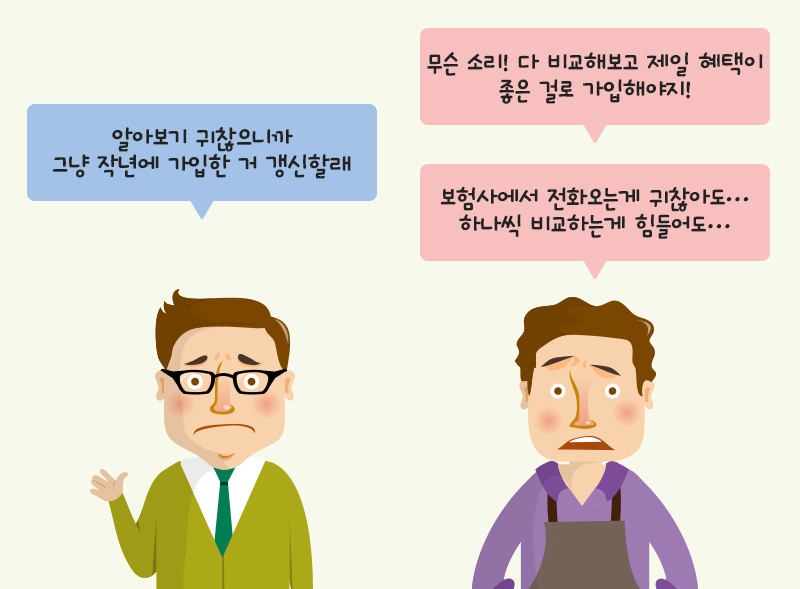자동차보험을 갱신해야 하는 A씨와 B씨! A씨는 이것저것 비교하는 것이 귀찮아 작년에 가입한 보험에 그대로 가입하기로 합니다. 반면 가성비를 중요하게 생각하는 B씨는 보험사별로 일일이 비교를 시작하는데요. 보안프로그램을 설치하고… 공인인증서를 깔고…. 보험료를 겨우 조회하고 전화가 오는 것이 귀찮지만, 자동차보험을 더 저렴하게 가입할 생각에 이 정도는 감수할 수 있다고 생각합니다.