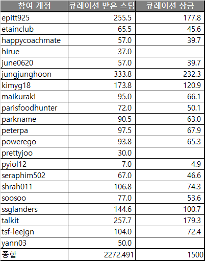 참여한 분들이 서로간 큐레이션 해주신 스팀은 총 2272.491입니다.