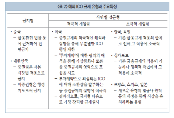 ICO에 대한 해외 규제동향은 우리나라를 제외하고 대부분의 국가가 일정한 규제방향을 설정한 상태이고, 전면금지를 선언한 중국마저도 향후 일정한 규제 방향을 제시할 것으로 전망된다. 이러한 국제적 추세에서, 우리나라만 계속 전면금지 정책을 유지하기는 힘들 것으로 보이며, 이제 우리나라도 전면금지 이외의 적절한 규제수단을 고민해 보아야 할 시점이다. 대부분의 ICO는 전 세계 투자자를 상대로 자금모집을 행하기 때문에, 우리나라에서만 금지한다고 하여, 한국 투자자를 완벽하게 보호할 수 있는 것이 아니다. 따라서 국제적 추세 외에도, ICO의 국제성을 감안하면 현재의 전면금지 정책을 계속 유지할 명분은 크지 않다고 본다.