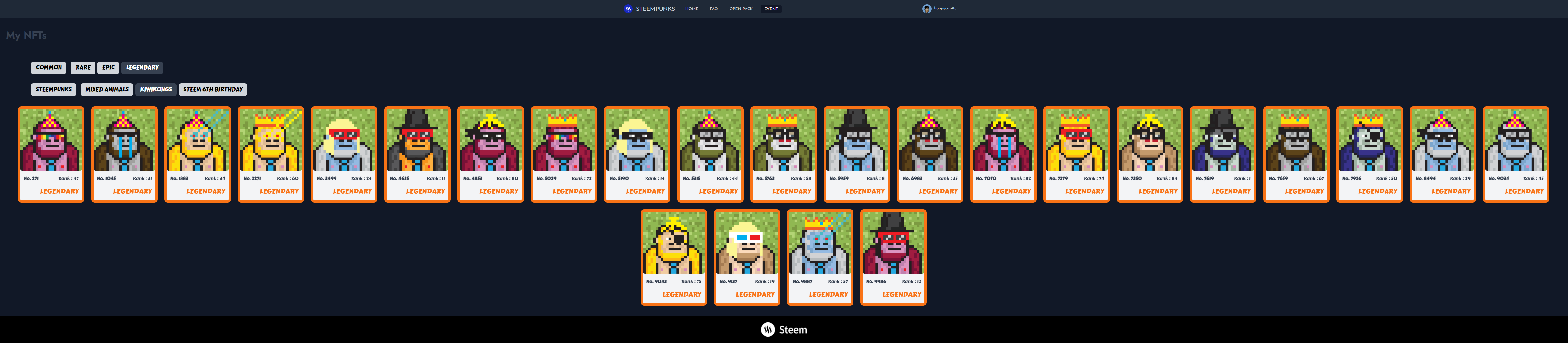 스팀펑크(SteemPunks) 키위콩즈(KiwiKongs) 민팅(Minting) 참여 후기happycapital (88)in #kr • 4 years ago (edited) 랭크 1위 레전드리가 나왔네요 🤩 저번 민팅 참여 대비 이번에는 운이 좋아 레전드리가 많이 나왔어요. 몇 개인지도 셀 수가 없네요. 2만 스팀만 더 있다면 아직 안 팔린 팩들 제가 다 살 수 있을텐데, 현재 상황이 아쉽습니다 🥲 #steempunks #kiwikongs #nft #minting #steem