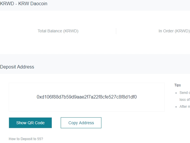 KRWD를 입금하는 버튼을 눌러보니 이더리움 주소를 보여준다.