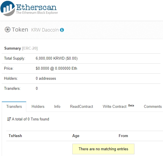 6백만개의 KRWD 토큰이 발행되어 있고, 어떠한 토큰전송기록도 보이지 않는다.