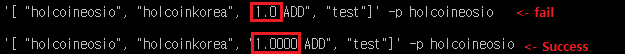 토큰을 전송하는 명령어 입니다. 주의할 점은 수량 "1.0000" 소숫점 4자리까지 가급적 채워 주시기 바랍니다. EOS 전송시에서는 "1.0" 소숫점 1자리도 됬으나, 다른 토큰 전송시에서는 에러가 발생 했습니다.