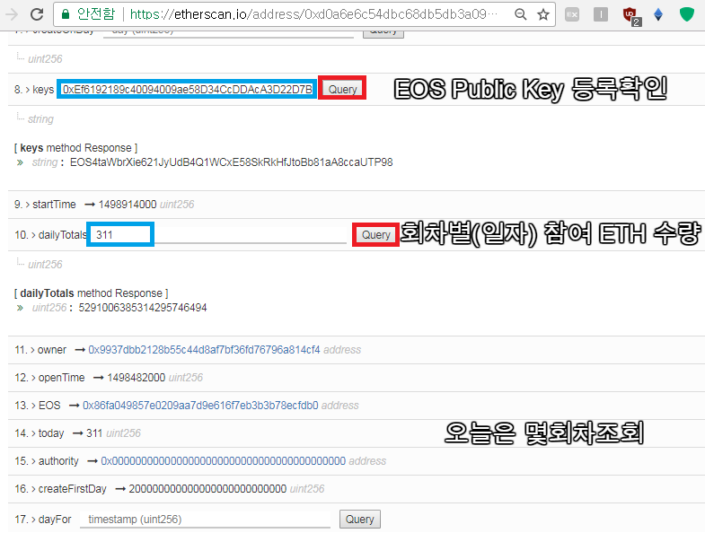 이더스캔을 통한 조회이니 정확하며, 10 번항목에 당일 회차를 입력후 조회(Query) 하면 조회 싯점의 실시간 ETH 총 수량을 보실 수 있습니다. 당일 회차 정보는 14번 항목에 표시 됩니다.