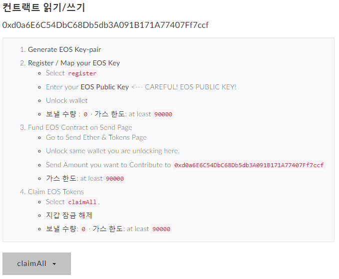 www.myetherwallet.com 또는 www.mycrypto.com 사이트에서 컨트랙트메뉴를 통해 EOS Constribution 을 선택후 아래처럼 ClaimAll 을 이용하시면 참여한 회차별 EOS 토큰을 다 받게 됩니다.