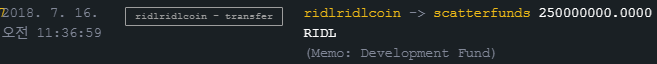 RIDL 토큰을 펀딩 계정인 scatterfunds 계정에 250,000,000 개 전송한후, 펀딩에 관련된 컨트랙트를 등록후 펀딩이 시작 되었으며, 관련 내용을 컨트랙트 소스를 통해서 확인 했습니다.
