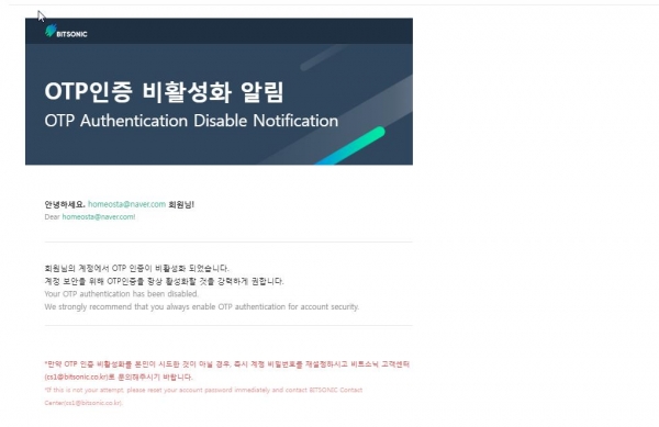 비트소닉 해킹 사건의 진실 기사 OTP 비활성화 메일로만 연락 받아 내부자일 가능성이 높다