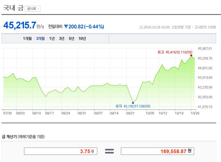 1g당 금 시세를 보면 2018년 9월 28일 42192에서 10월 29일 45216으로 그래프가 거의 계속 상승만 했다. 금이 오른다는 것은 돈을 가진 세력이 어떤 공황에 준하는 사태를 대비해 보험을 든다는 것이다.