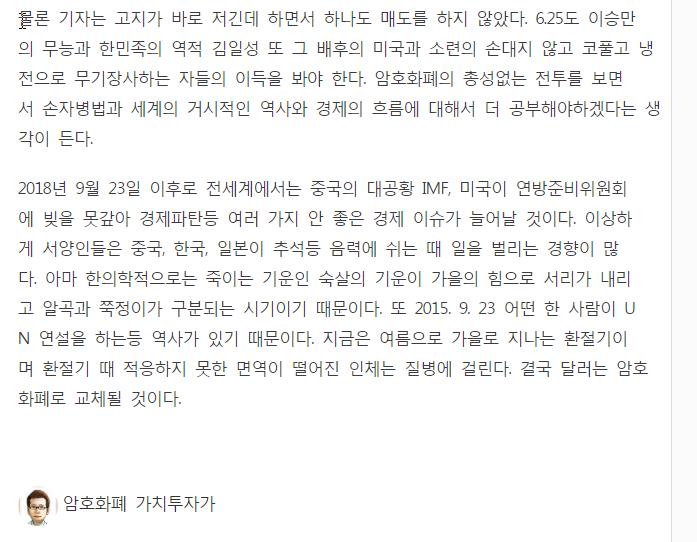 기자가 가장 추천하는 것이 암호화폐 매매이다. 기자는 2017년 1월부터 비트코인 투자를 시작으로 연말에는 20배정도 수익을 보았고, 그 이후에 정부의 반시장적인 파시즘, 공산주의 정책으로 2.5배정도 현 수익이 있는 것 같다. 물론 팔지 않았으니 완전히 돈을 번 것은 아니며, 지금도 꾸준히 투자중이다. 문제는 그냥 오래 시세가 홀딩만 하고 있으니 점차 조금씩 돈을 잃고 마는 것이 문제였다. 비트코인은 2018년 7월 이후로 7000-8000사이로 횡보를 하고 있다. 이것은 세력들이 공황을 시켜놓기 전에 비트코인 가격을 눌러놓고 2100만개 개수가 한정되고 디플레이션이 되는 강점을 독식하고자 하기 때문이다.