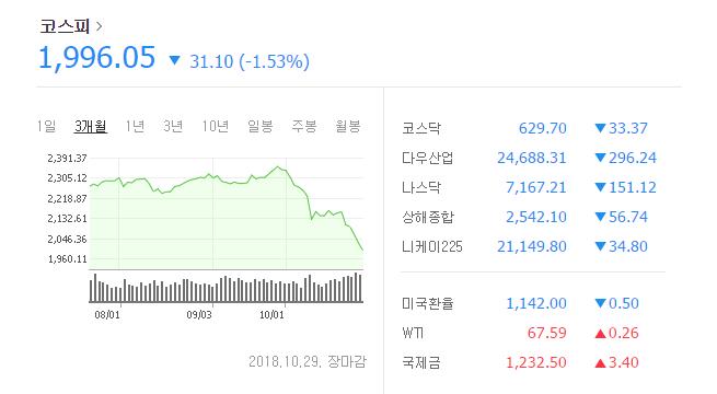 10월 29일 뉴스를 보면 2016년 12월 7일(장중 저점 1,987.26) 이후 22개월여 만에 2000선이 무너지고 1,996.05으로 마감했으니 전일대비 하락 31.10 (-1.53%)이다.
