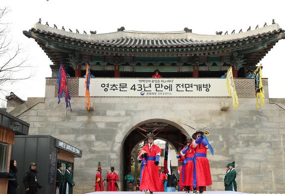 뉴스를 보니 2018년 12월 6일 서울 경복궁에서 열린 영추문 개방행사에서 취타대가 영추문으로 입장하고 있다는 축하공연을 하고 있다.