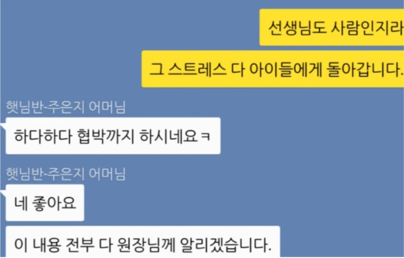 유치원이나 어린이집 선생님의 고충.hotsummer (39)in #kr • 8 years ago (edited)요즘엔 자식을 가진 오지랖 넓거나 생각이 짧은 사람에게 맘충이라는 단어를 사용합니다. 이 카톡내용만 봐도 정말 맘충이라는 소리가 절로 나오네요. 물론 안그런 부모님들도 많겠지만 극소수의 부모님 때문에 이런 신조어가 생겨났습니다. 참 안타깝습니다. #kr-join #kr-newbie #jjangjjangman