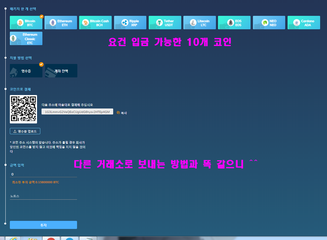 1000불이상 코인부터 예치가능 [ 1000불 : 약 0.15BTC = 그날 시세에 따리 변동]