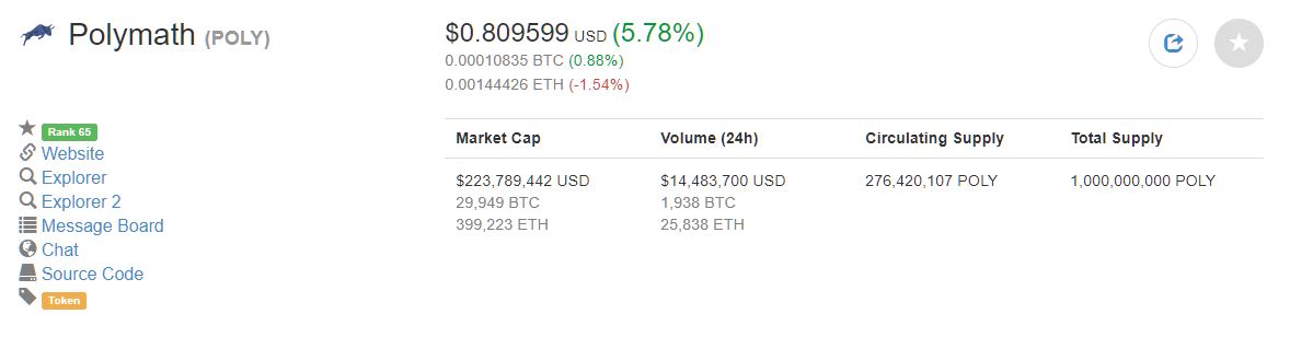 폴리매스는 국내 거래소 업비트에 POLY 원화 거래가 5월 29일에 상장되었습니다. 현재 10억 개의 발행량 중 2억 7천 개 정도가 유통된 상태입니다.